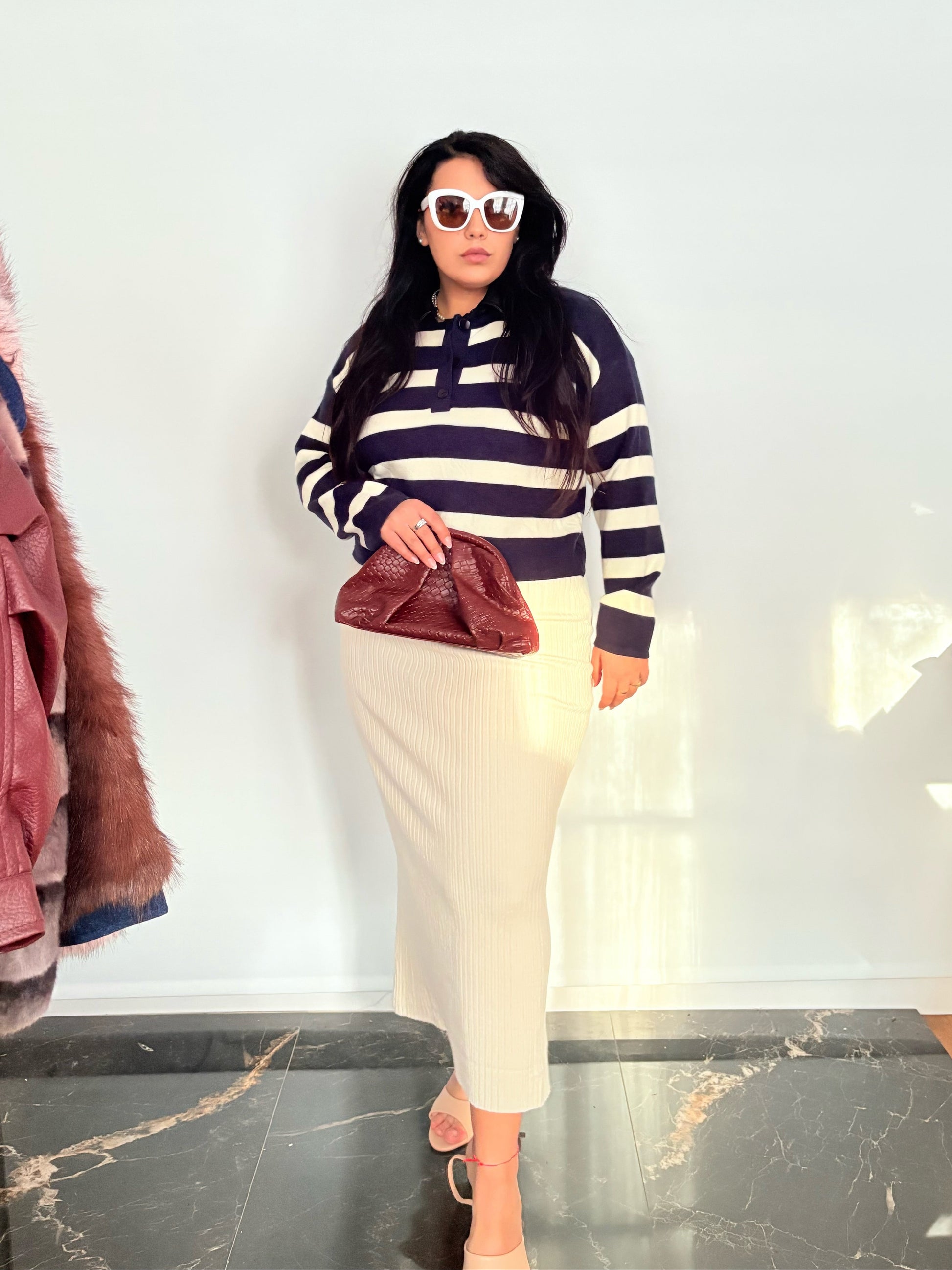 Dettaglio colletto di pelle e bottoni al petto